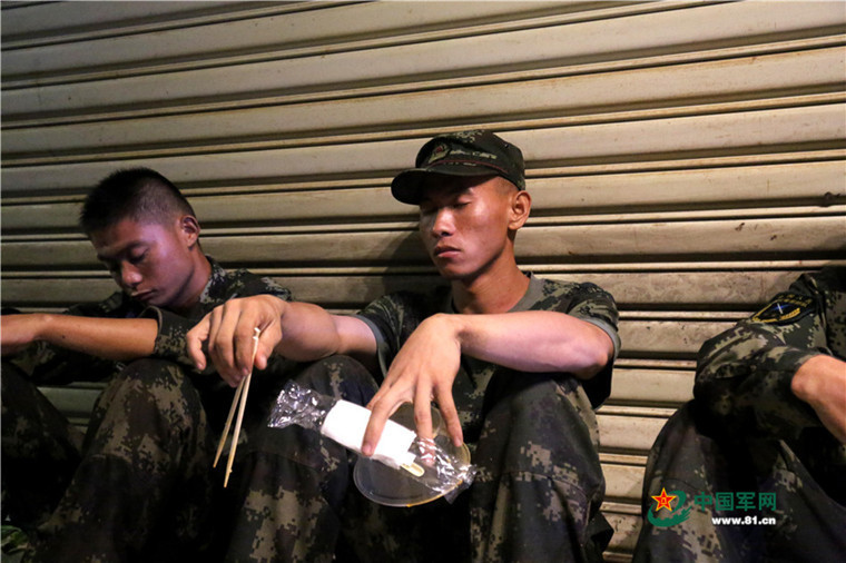 2017年,我军官兵珠海救灾,街头露宿,和衣而卧街道旁。