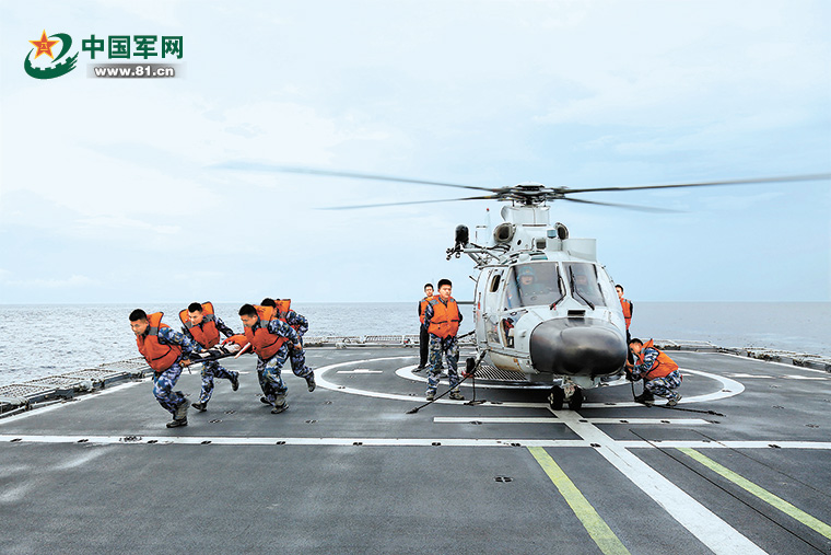15分钟后,直升机发现落水者,迅即向运城舰报告具体方位。运城舰指挥员立即发出“救生部署”指令,吊放的小艇高速驶向落水点,成功营救起一名落水者。直升机也通过吊放救生员营救起另一名落水者。
